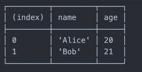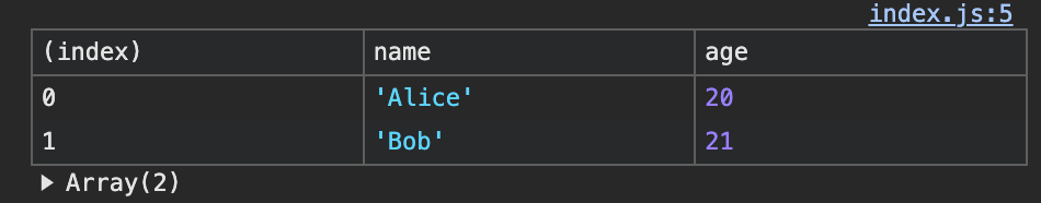 - console.table ():以表格的形式显示数据(数组或对象)。