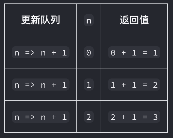 假设有如下文件:javascript import { useState } from 'react'; export default function Counter() { const [number, setNumber] = useState(0); return ( <> <h1>{number}</h1> <button onClick={() => { setNumber(number + 1); setNumber(number + 1); setNumber(number + 1); }}>+3</button> </> ) } 当点击按钮时,number 只会加 1,React 中的处理逻辑是: 1. setNumber(number + 1) : number 是 0 所以 setNumber(0 + 1) 。- React 准备在下一次渲染时将 number 更改为 1 。2. setNumber(number + 1) : number 是 0 所以 setNumber(0 + 1) 。- React 准备在下一次渲染时将 number 更改为 1 。3. setNumber(number + 1) : number 是 0 所以 setNumber(0 + 1) 。- React 准备在下一次渲染时将 number 更改为 1 。 |