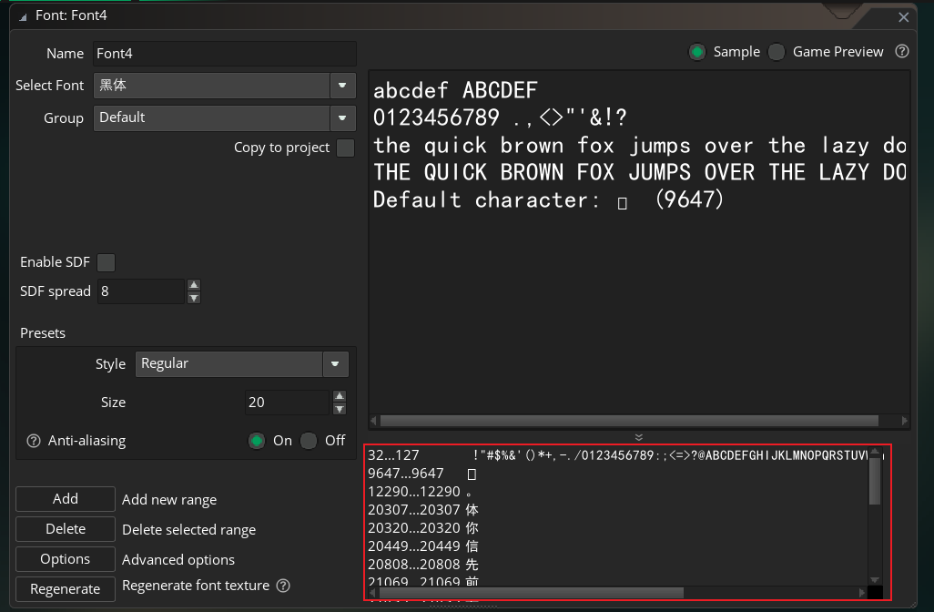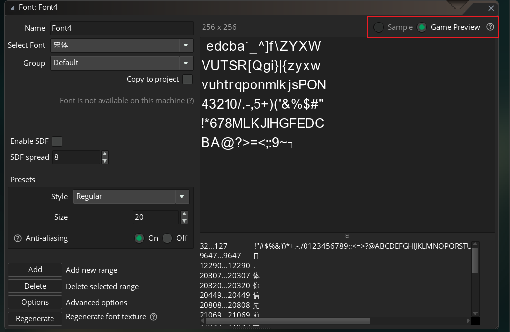 编辑页面右上角【Sample】不可选择的字体,就算支持中文,也无法正常显示(原因未知),宋体、微软雅黑均是。